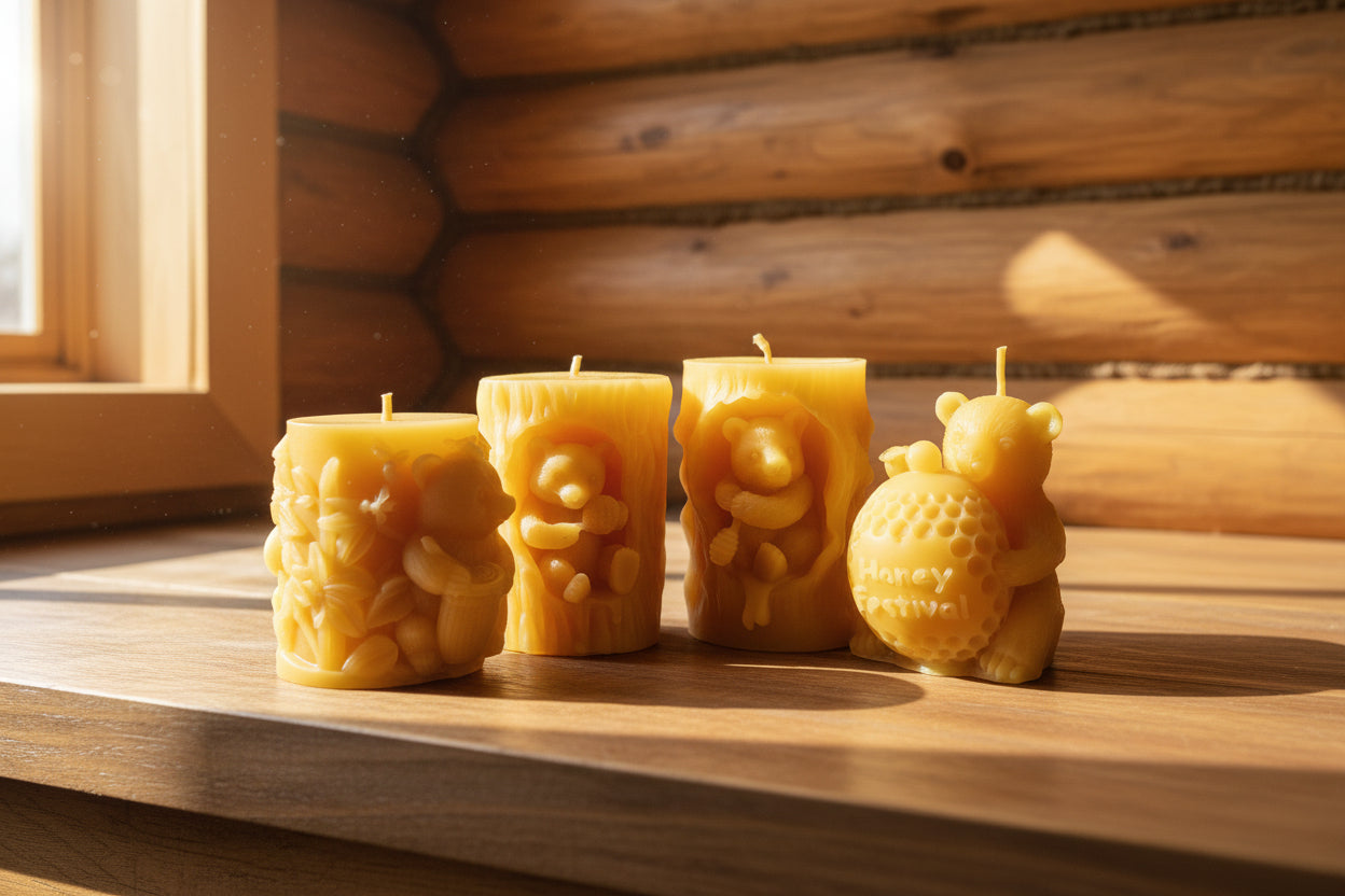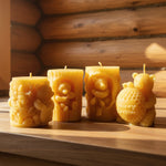 Four unique beeswax candles inspired by bears and honey, ranging from 4.7 to 7.6 oz each. These charming pieces bring a cozy, nostalgic vibe — think Winnie the Pooh meets artisan candle craft. Perfect for gift-giving or warming your home.